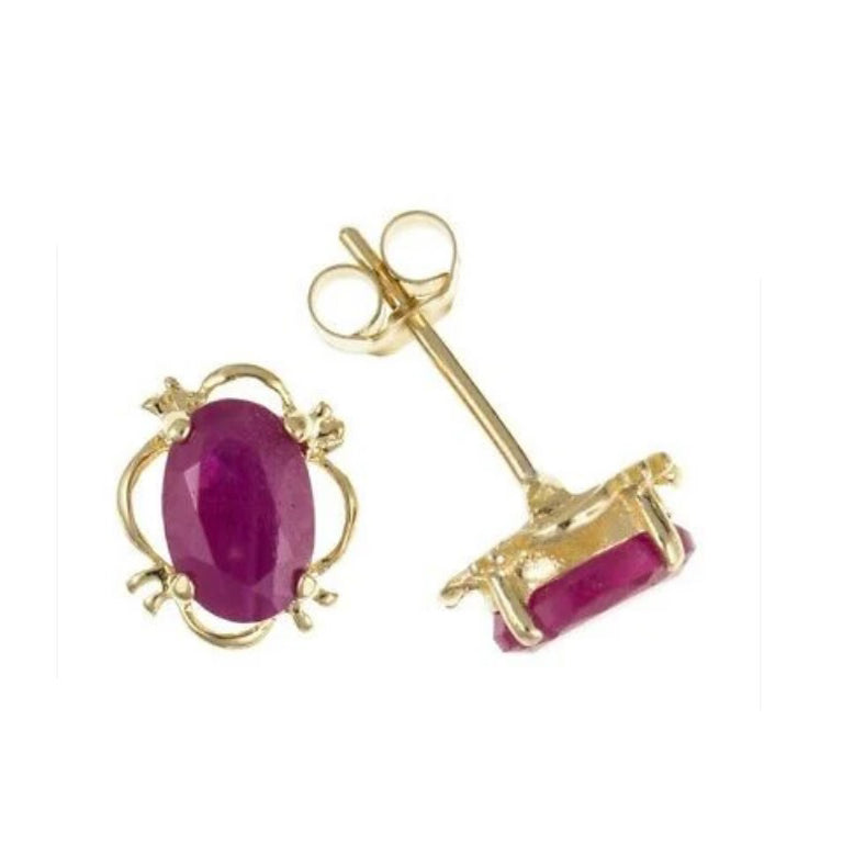 Yellow Gold Real Ruby Oval Fancy Stud Earrings - British Made - Hallmarked