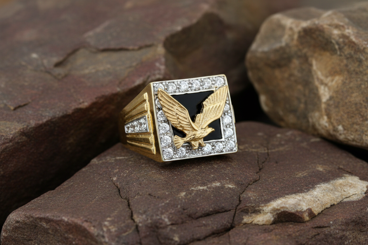 | Men's 9ct yellow gold hand finished men's onyx and cubic zirconia set eagle ring. | |