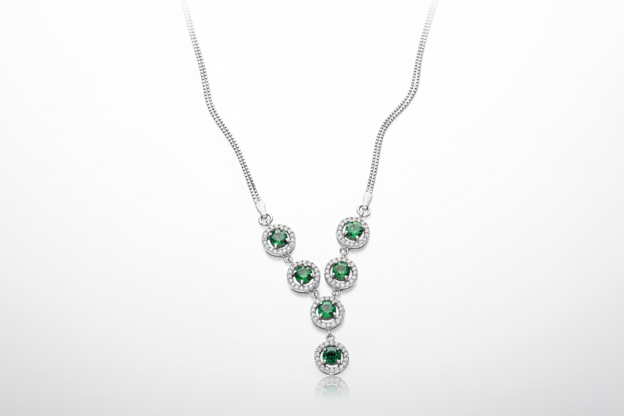 This sophisticated emerald necklace exemplifies British craftsmanship and timeless elegance. Fashioned from solid sterling silver 925 with hallmark certification, the piece features a luxurious rhodium plating that enhances durability and maintains its lustrous finish. The necklace showcases carefully selected emerald ovals, each measuring approximately 7 x 5mm, selected for their rich colour and natural beauty. The 18-inch (46cm) length offers versatile styling options, sitting gracefully at the collarbone for both everyday refinement and formal occasions. The rhodium coating provides superior resistance to tarnishing, ensuring your investment retains its brilliance for years to come. Each piece arrives brand new and beautifully boxed, ready for gifting or personal enjoyment. A distinguished addition to any jewellery collection, this necklace combines the prestige of British hallmarking with the enduring appeal of emerald gemstones.