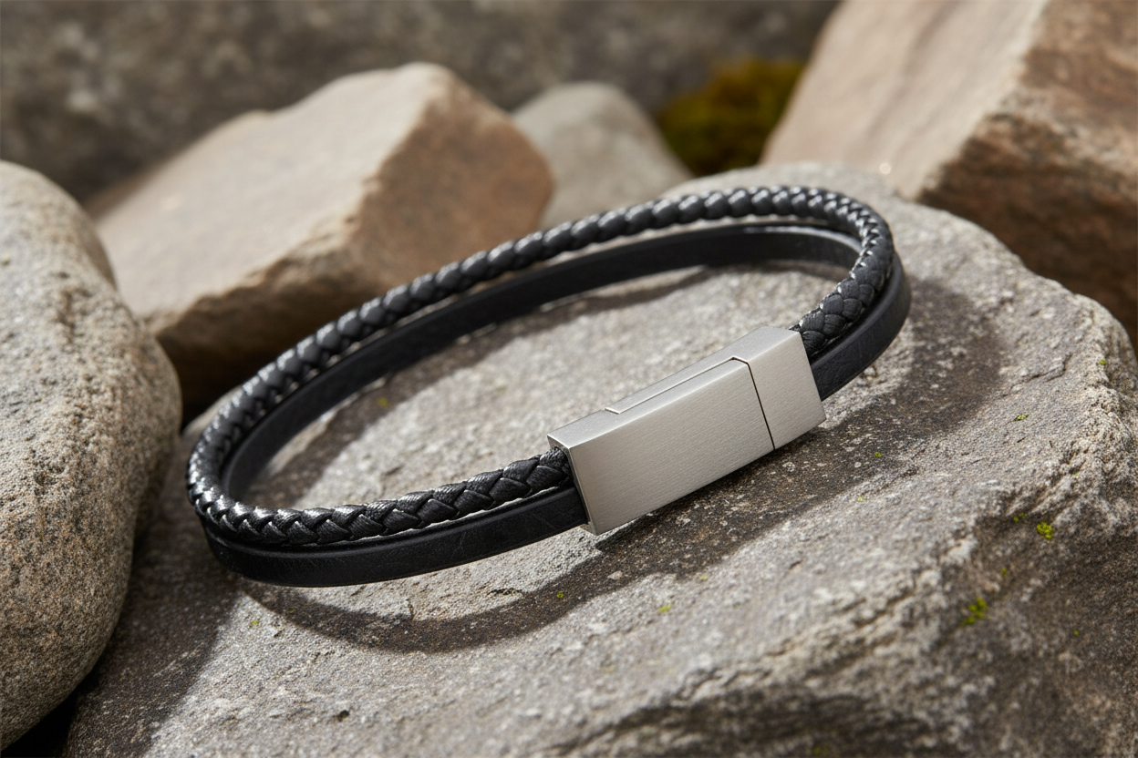 | Material: | Stainless Steel and Recycled Black Leather |