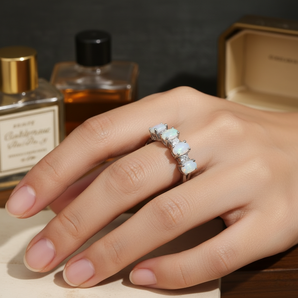 This Natural Opal and Diamond Eternity Ring in Solid Sterling Silver 925 is a stunning piece of fine jewellery perfect for special occasions such as engagements, weddings, and anniversaries. The oval-shaped opals as the main stone with a multicolour hue adds a touch of beauty and elegance to the ring. With a prong setting style and excellent cut grade, this ring is a symbol of love and timeless beauty, making it a perfect gift for Mother's Day, or Valentine's Day. The piece is hallmarked, signed, and comes with a seller warranty, ensuring quality and authenticity. Made in Great Britain by J R Jewellery, this ring is a luxurious and meaningful addition to any jewellery collection.