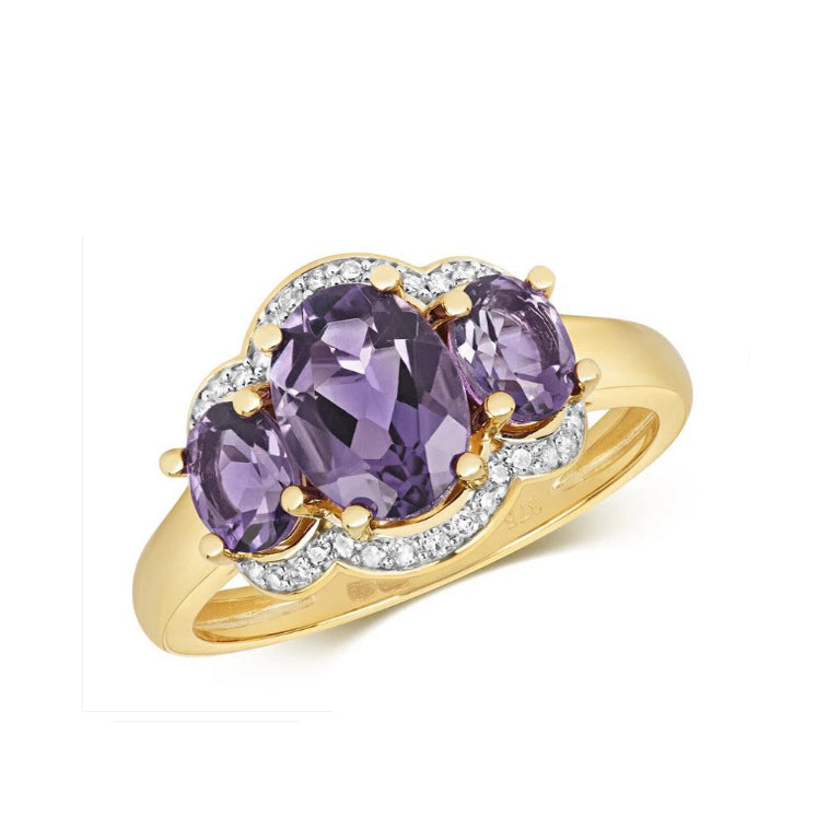 This is a stunning ring made of solid yellow gold, featuring three amethyst gemstones accented with 30 smaller diamonds. The ring is hallmarked, with a metal purity of 9ct. The design is a classic three-stone style, perfect for occasions such as engagement, Mother's Day, Christmas, graduation, wedding, anniversary, birthday, confirmation/communion, or Valentine's Day. The elegant piece is suitable for sizes J-Q and is a beautiful choice for those who appreciate the beauty of natural gemstones and fine jewellery craftsmanship.