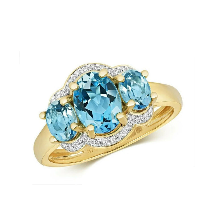Swiss Blue Topaz Three Stone & Diamond Ring 9ct Yellow Gold British Made Hallmarked