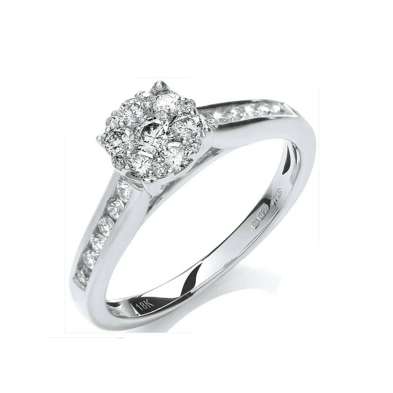 This unique engagement ring brings together a sparkling cluster of high grade diamonds to create big, eye-catching brilliance that's sure to make her say 'yes'. The setting gives a solitaire illusion and showing the highest standard of craftsmanship in UK hallmarked 18 carat white gold.