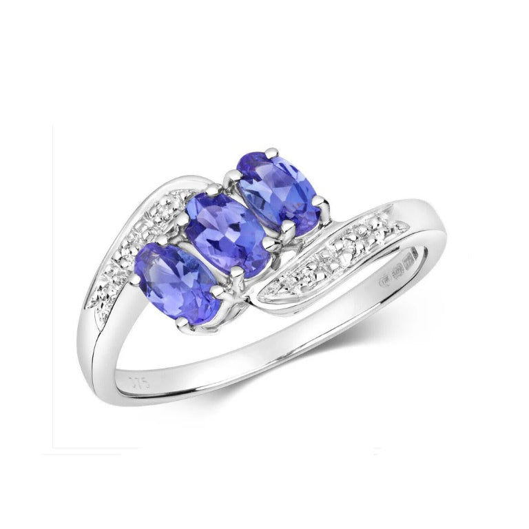 The beautiful genuine tanzanite three stone twist ring features the dazzling shine of the 9 carat white gold setting combined with the vibrant tone of the tanzanite stone. The ring also features diamonds that add to the sparkle.