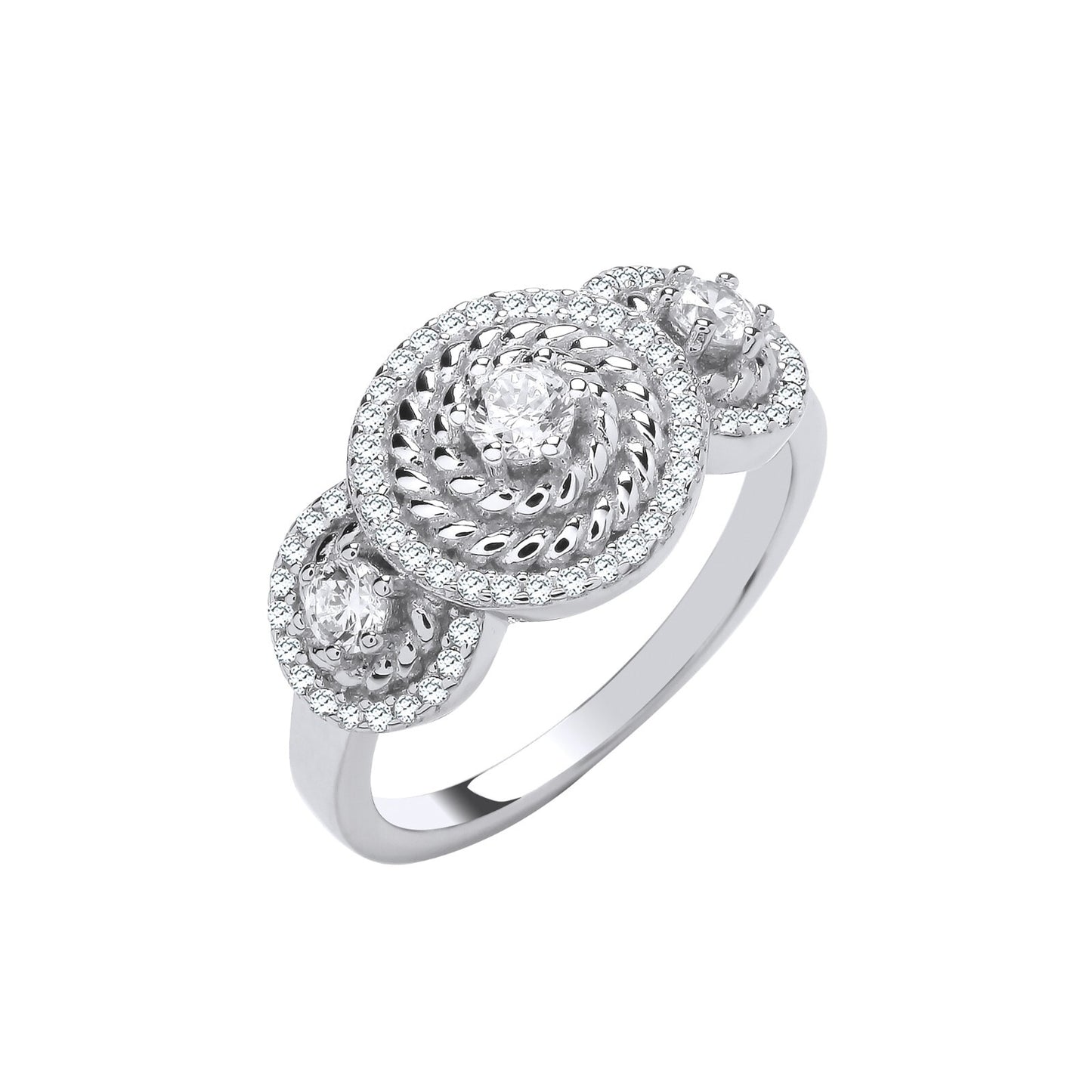 Solid Silver Trilogy Halo Zircon Ring Sizes J-Q British Made Silver 925 Hallmark